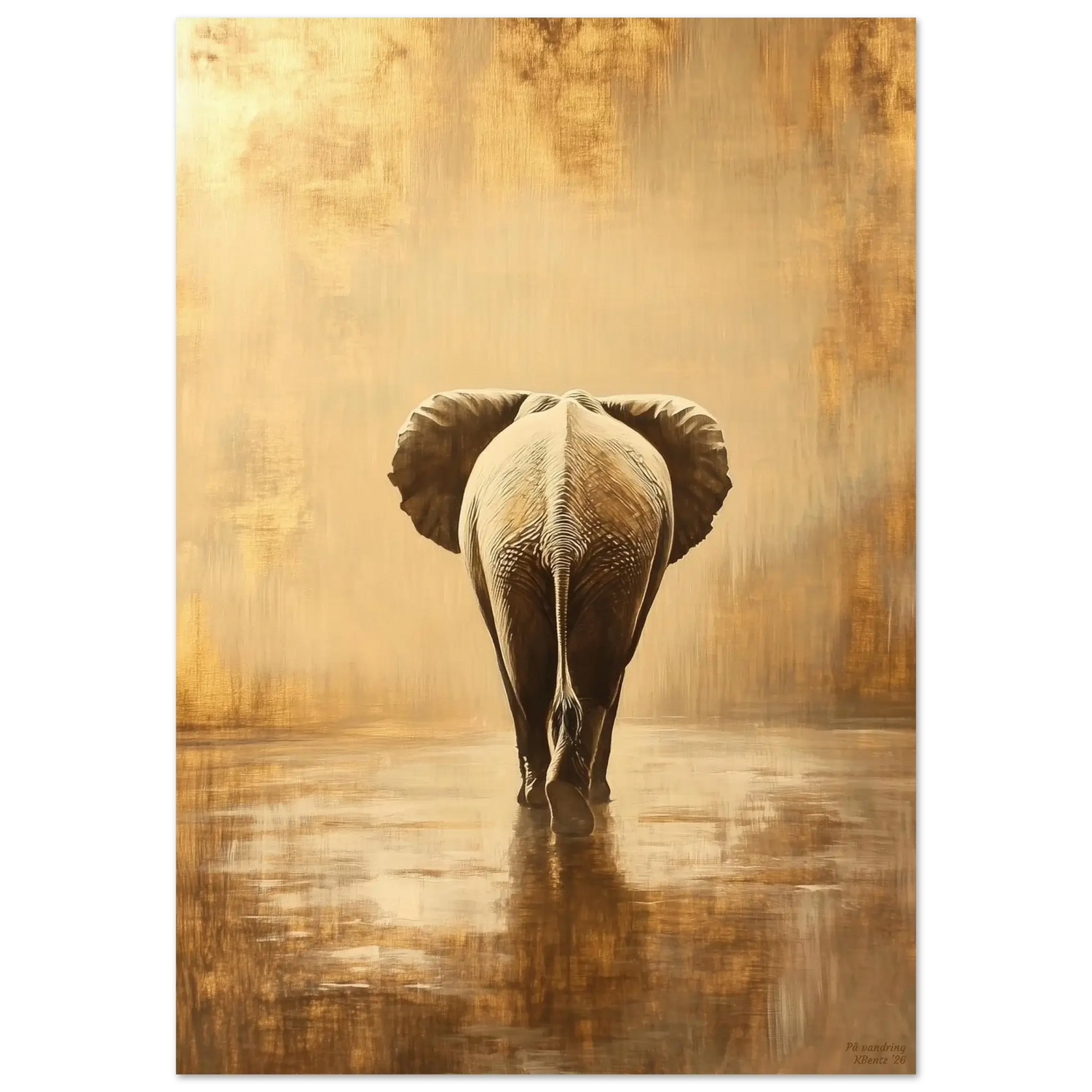På vandring viser en elefant sett bakfra, midt i bevegelse. Retningen er fremover, men målet er ikke synlig. Bildet handler om reisen i seg selv – om å gå videre, uten hastverk.