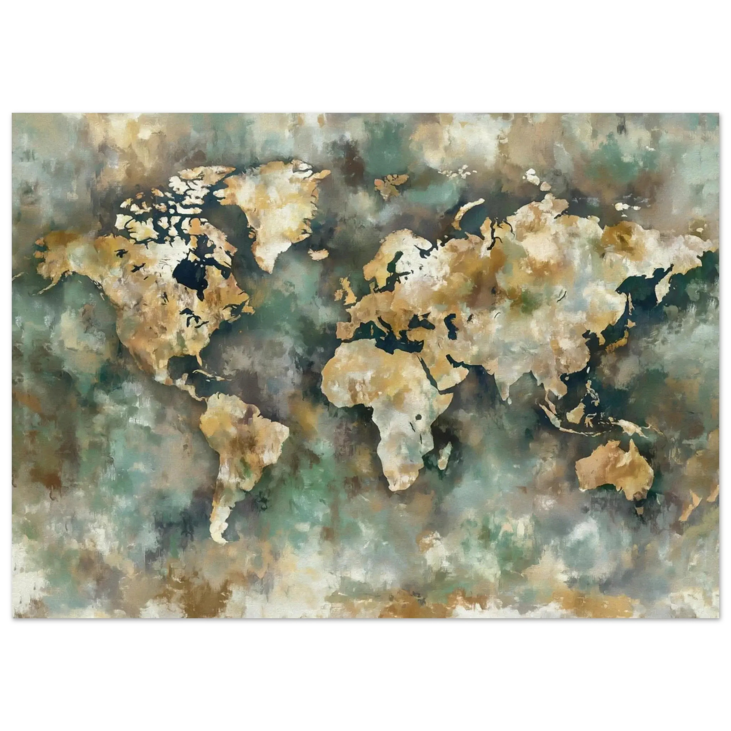 Dette unike verdenskartet er skapt i digital oljemaling med KI, Photoshop og Illustrator. Det har et kunstnerisk preg som gir dybde og stemning til rommet. Grønne fargetoner kombinert med myke penselstrøk skaper en harmonisk balanse som passer både i stue, kontor og soverom.